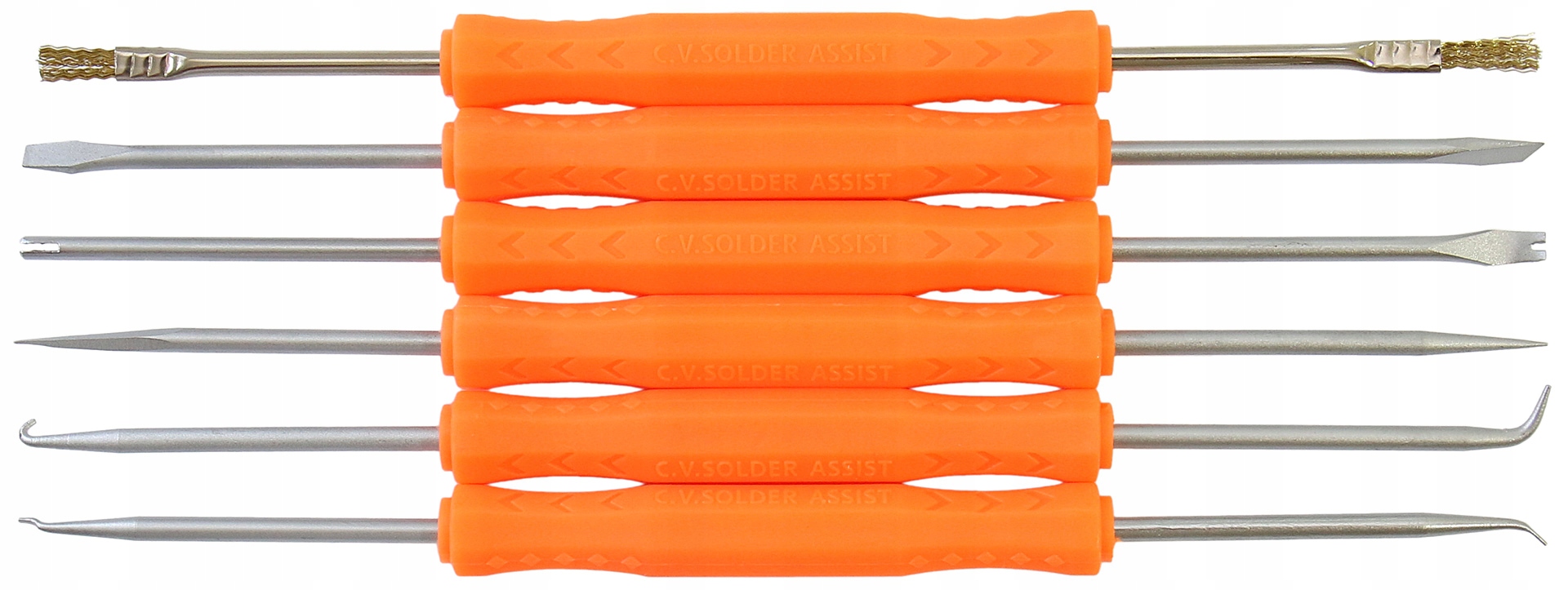 W zestawie pędzelek do czyszczenia, różnorodne skrobaki, wybijaki, haczyki oraz narzędzia do podważania i podtrzymywania.