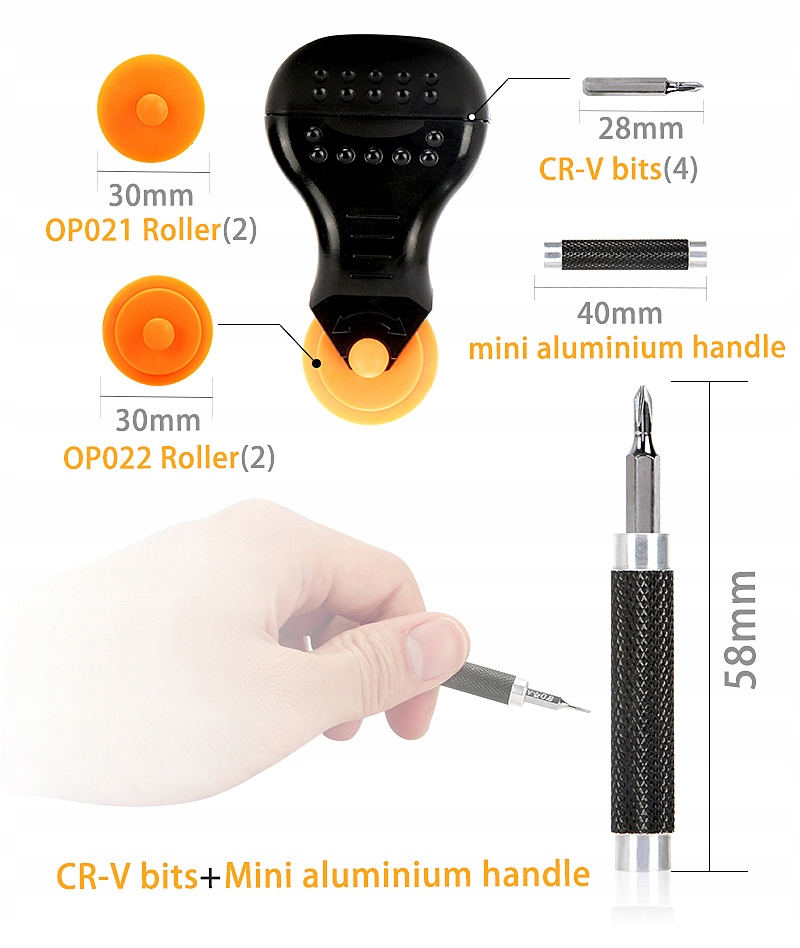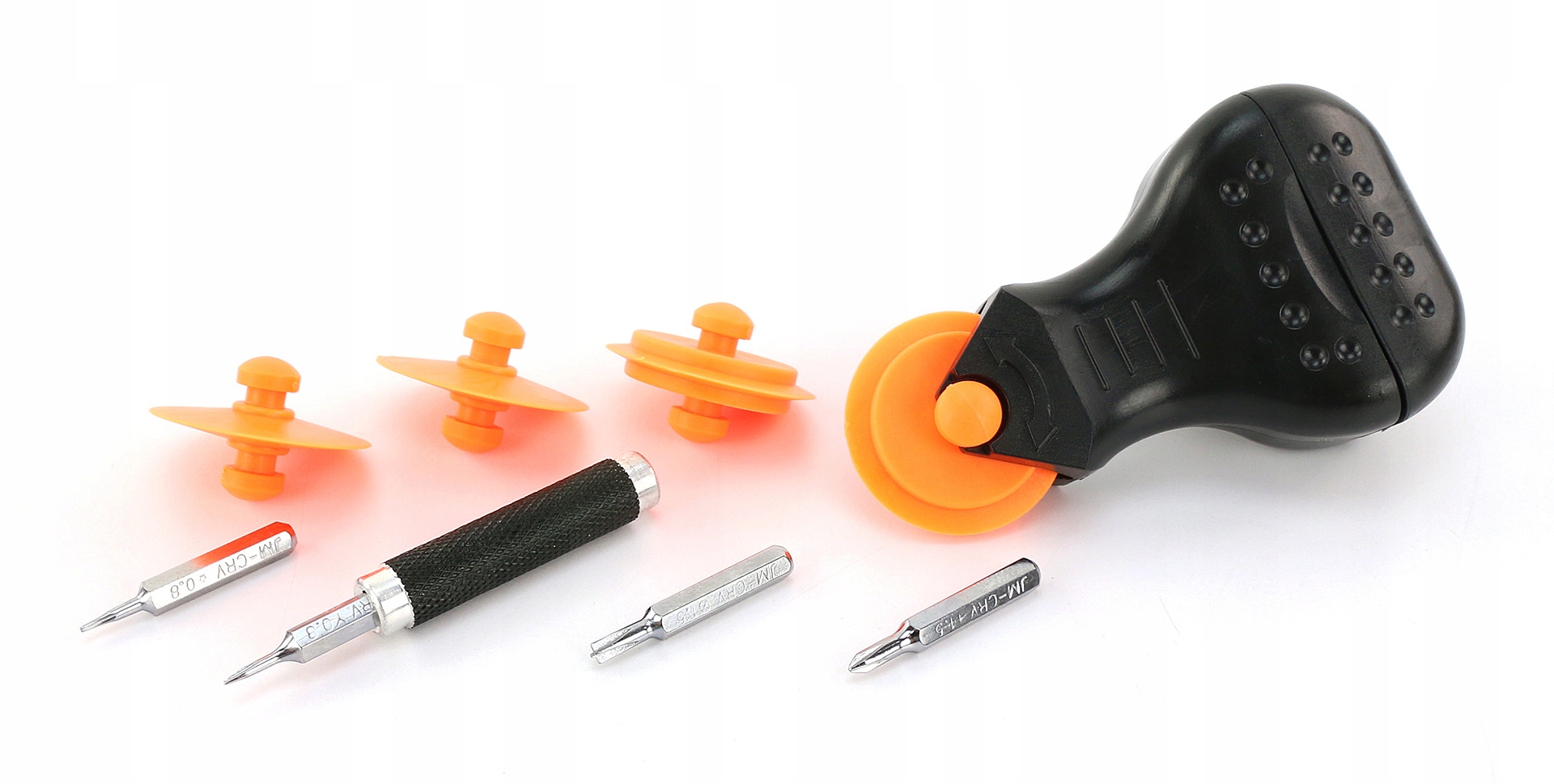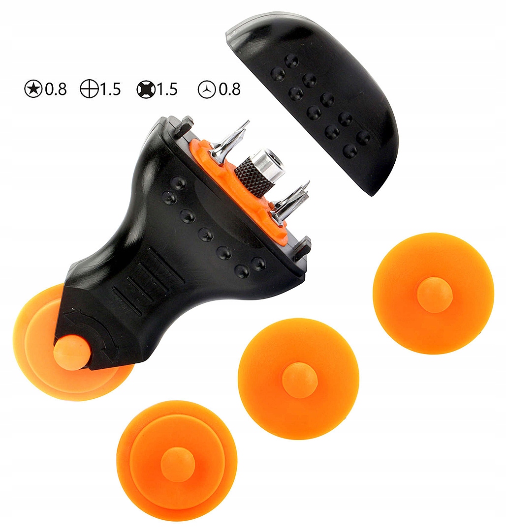 W zestawie znajdują się następujące otwieraki i wkrętaki potrzebne do otwierania obudów telefonów, tabletów i laptopów w szczególności różnych modeli IPhone:
