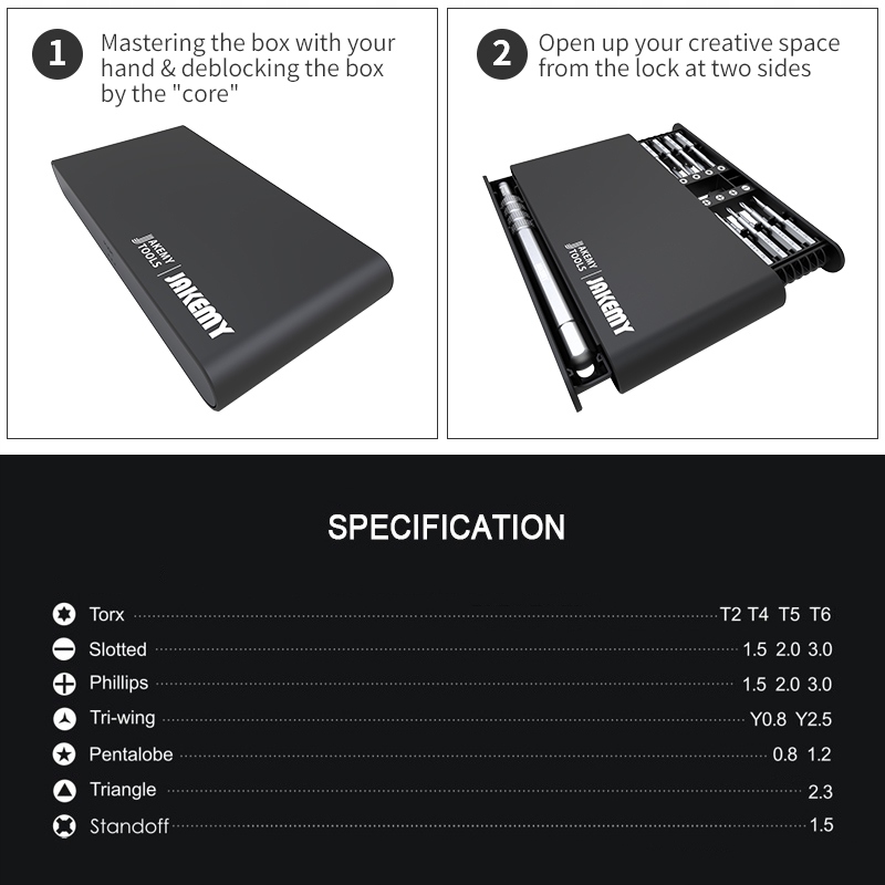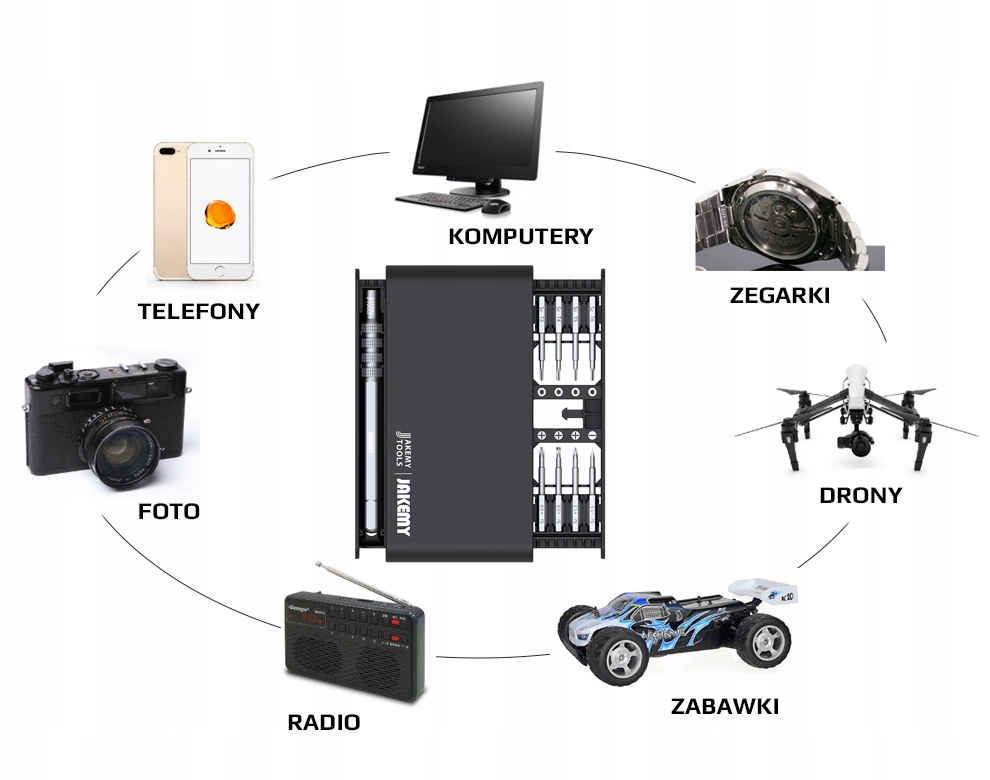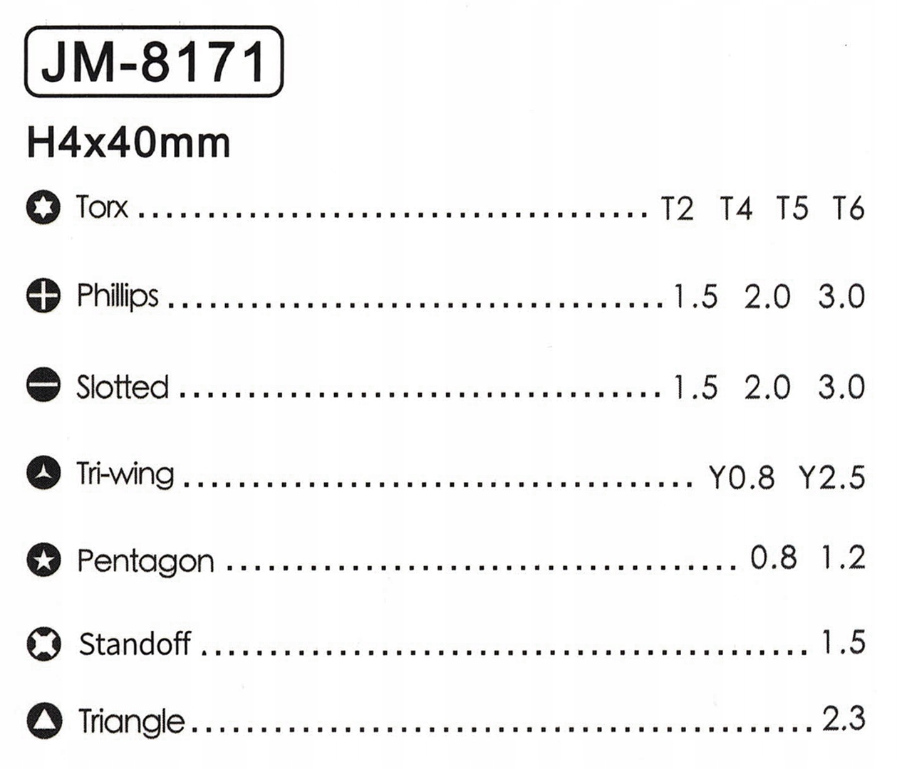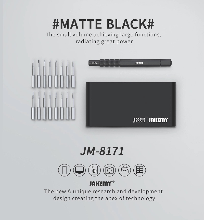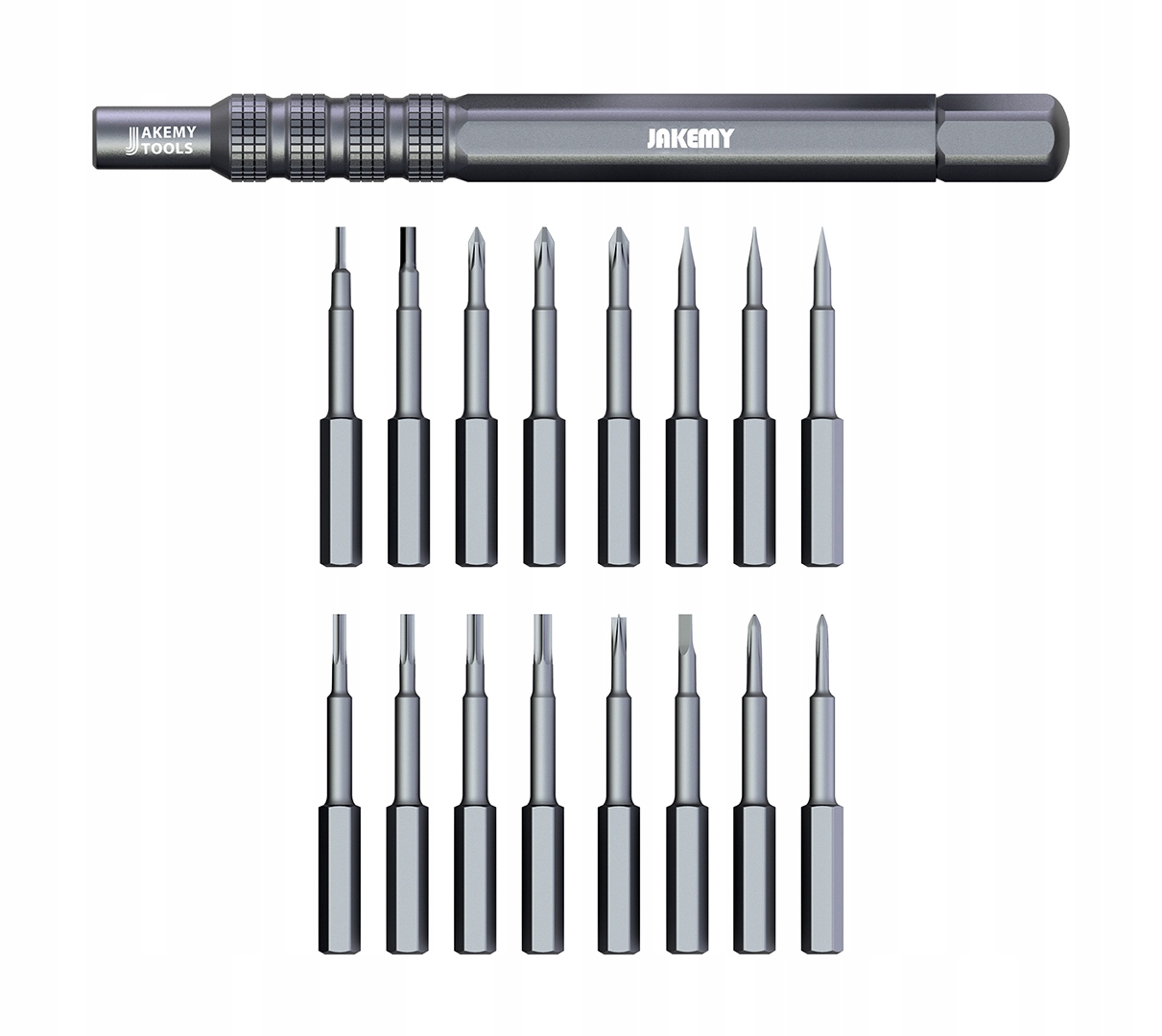 Jakemy JM-8171 to zestaw 16 precyzyjnych długich magnetycznych bitów z lekkim aluminiowym uchwytem przeznaczony do precyzyjnych napraw serwisowych telefonów i smartfonów w tym produktów Samsung, Huawei, Xiaomi, Oppo oraz Apple tj iPhone, MacBook Air i Pro.