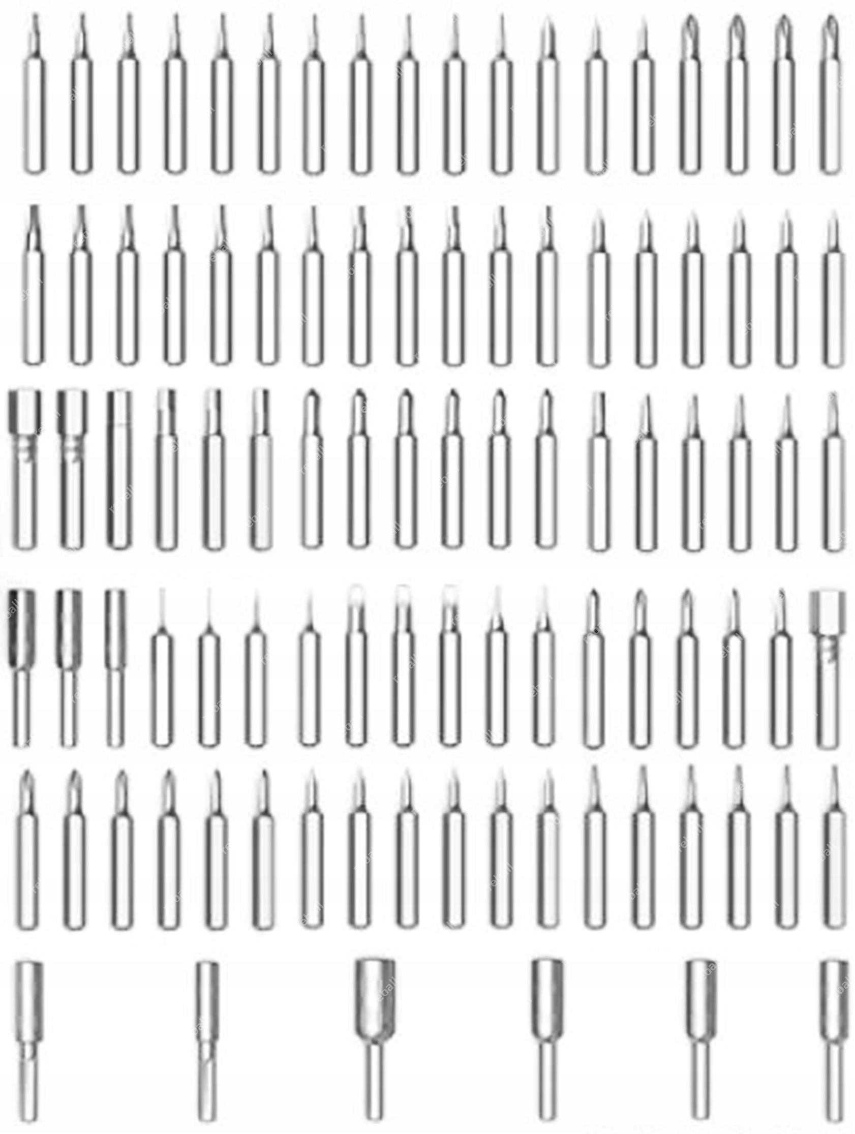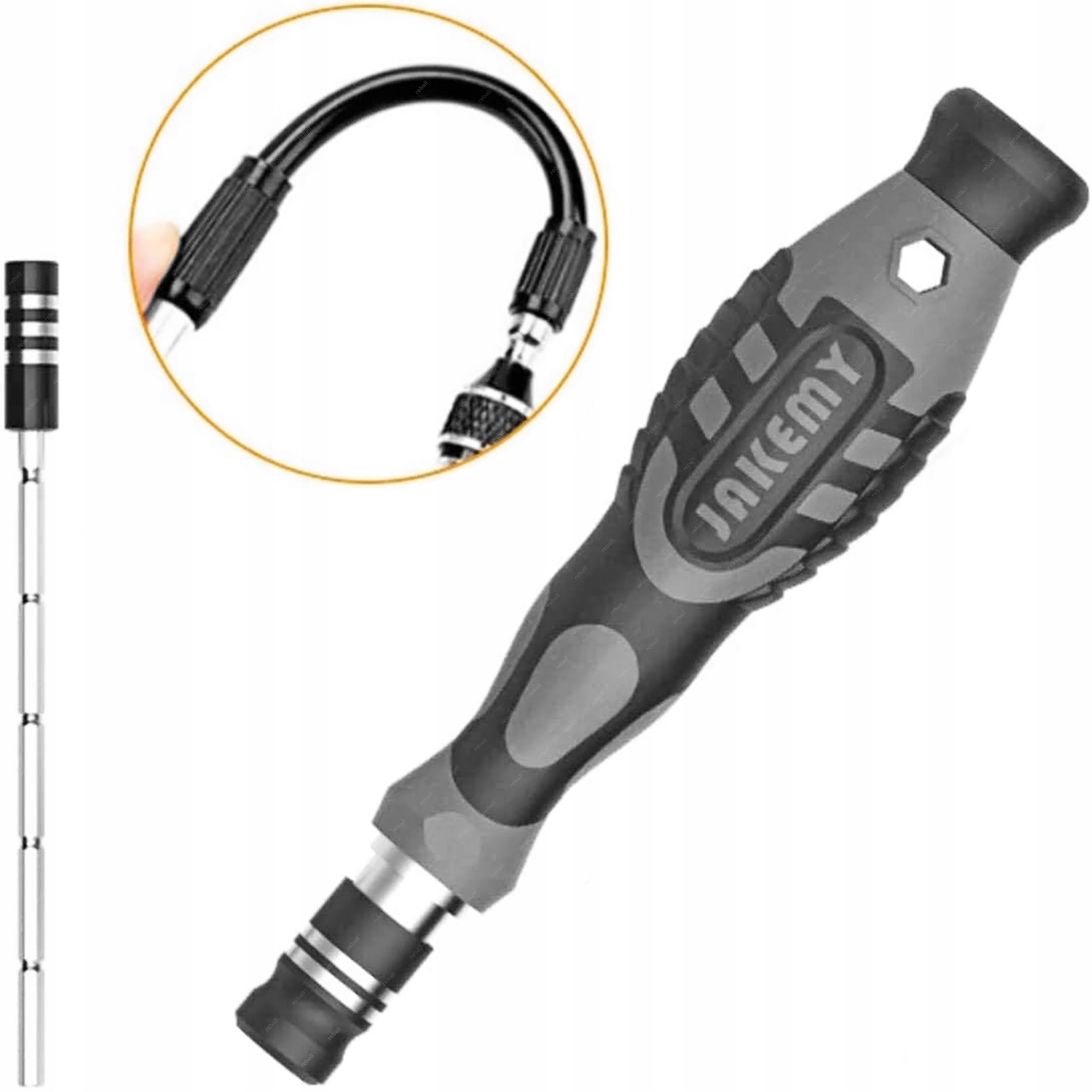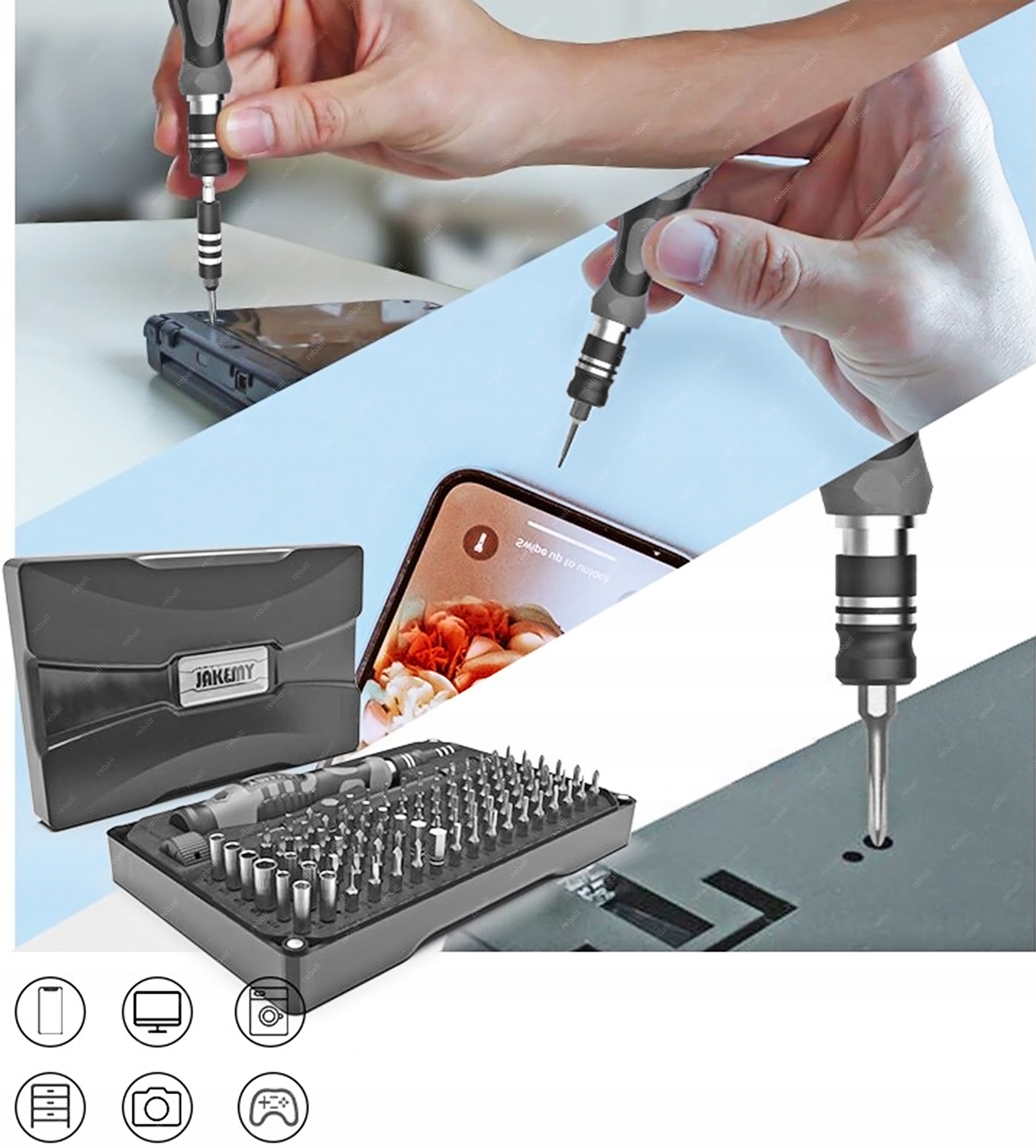 JAKEMY JM-8176 to zestaw 106 precyzyjnych narzędzi, bitów i otwieraków z lekkim uchwytem przeznaczonym do precyzyjnych napraw serwisowych telefonów i smartfonów w tym produktów marki Apple oraz wszelkiej elektroniki konsumenckiej.