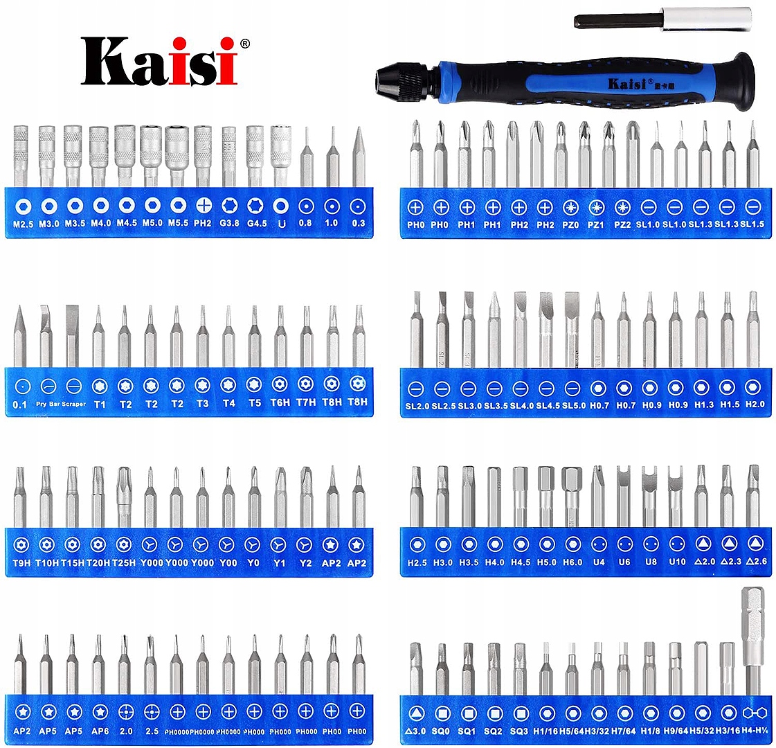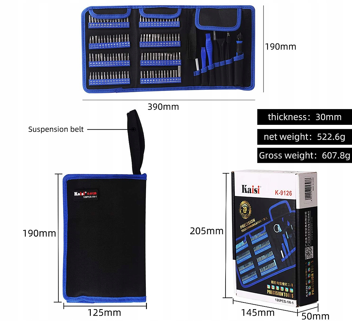 KAISI K-9126 to zestaw 126 precyzyjnych narzędzi, otwieraków i bitów z lekkim aluminiowym uchwytem przeznaczony do precyzyjnych napraw serwisowych telefonów i smartfonów oraz wszelkiej elektroniki konsumenckiej.