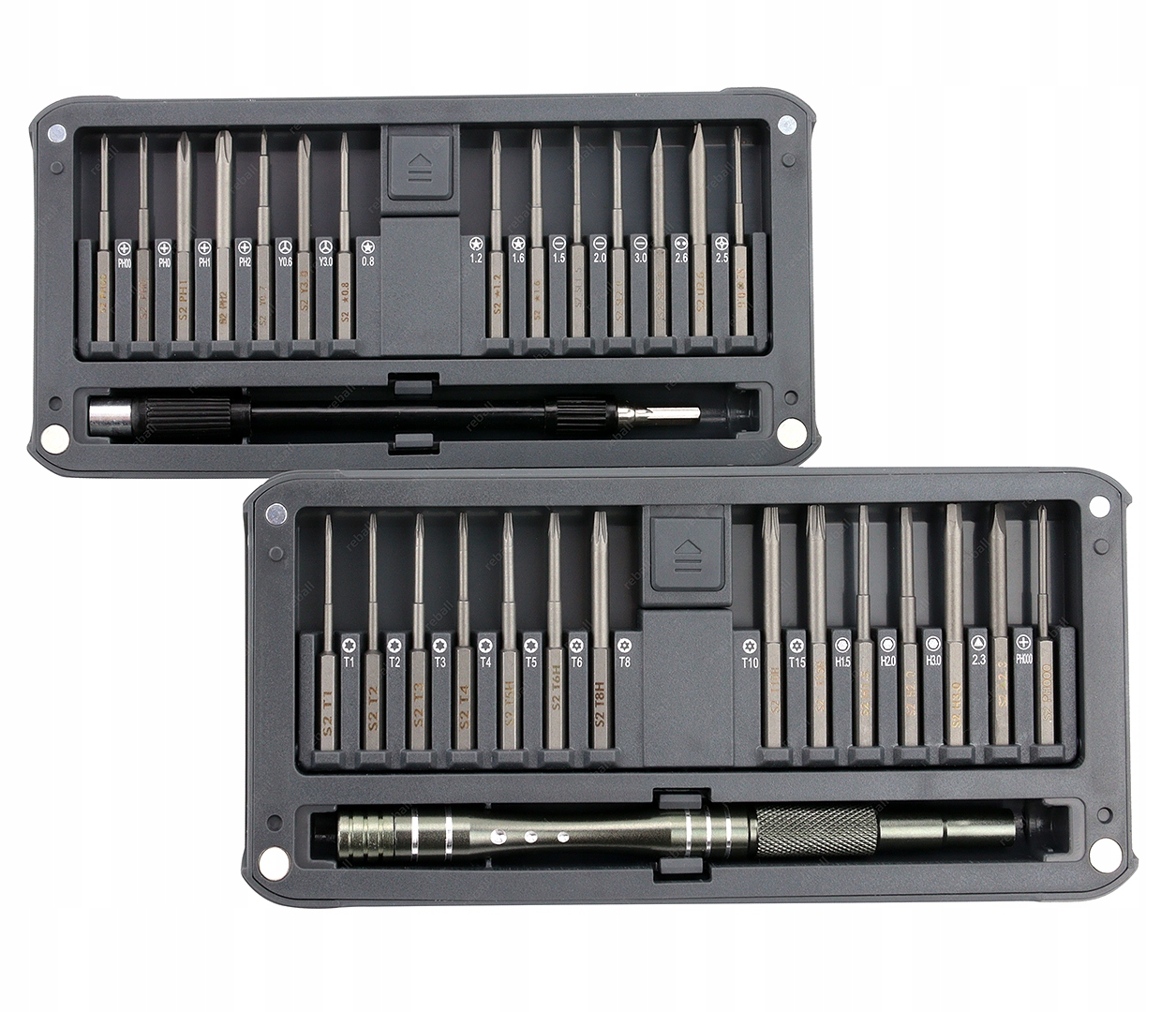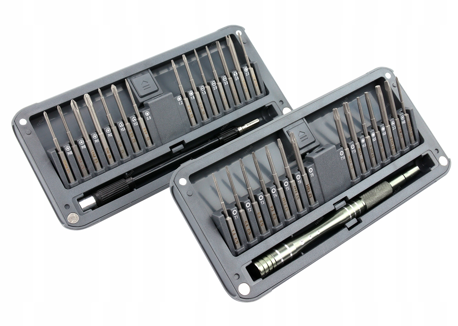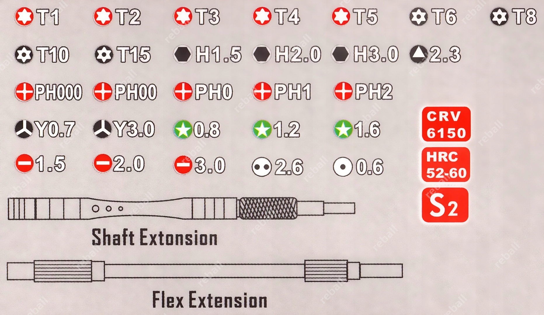 RT0142 to zestaw 30 wkrętaków (bitów) z lekkim aluminiowym uchwytem przeznaczony do precyzyjnych napraw serwisowych telefonów i smartfonów oraz wszelkiej elektroniki konsumenckiej.
