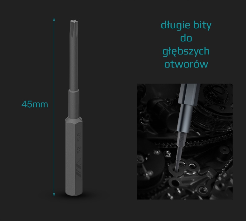 W zestawie 28 popularnych bitów (końcówek) o długości 45mm: