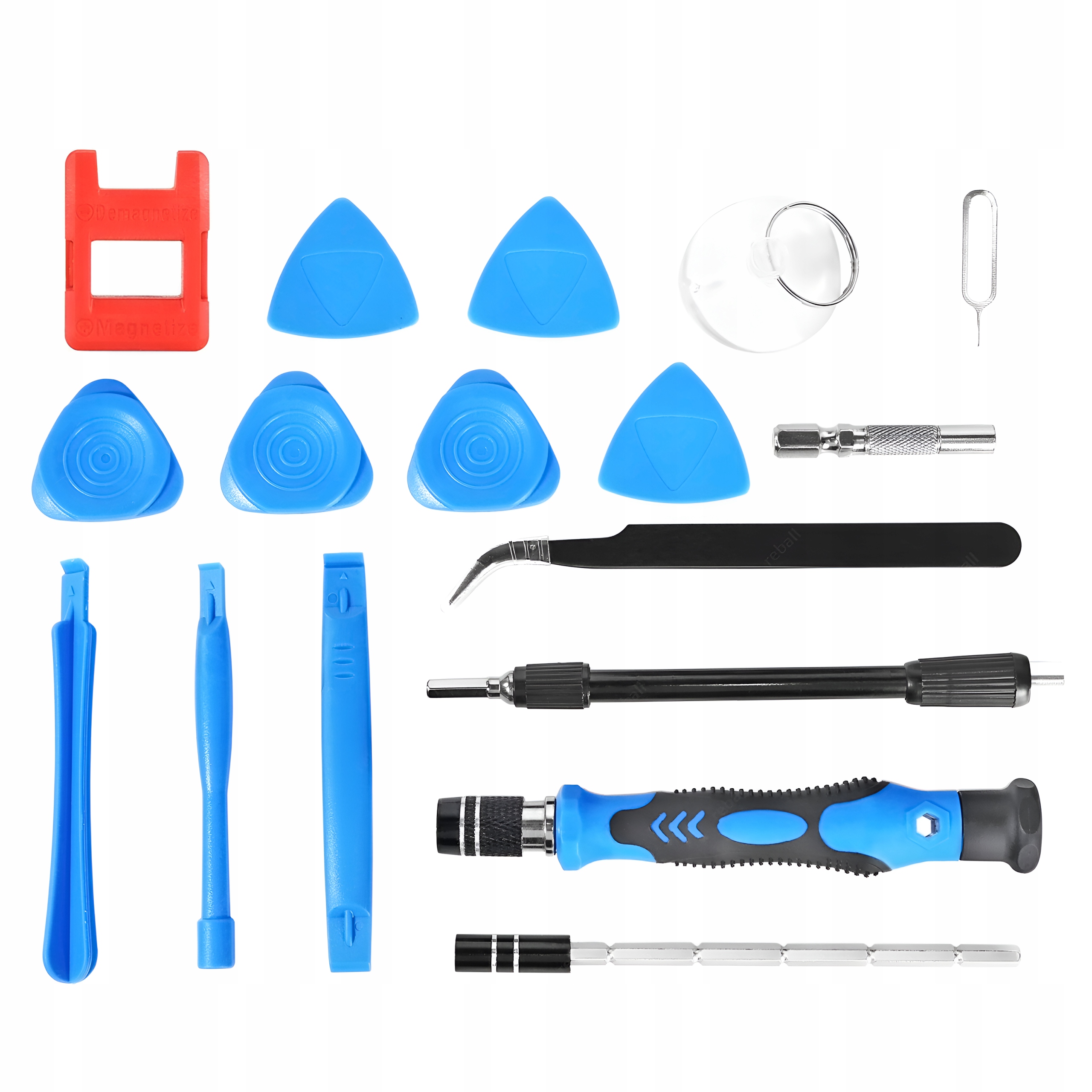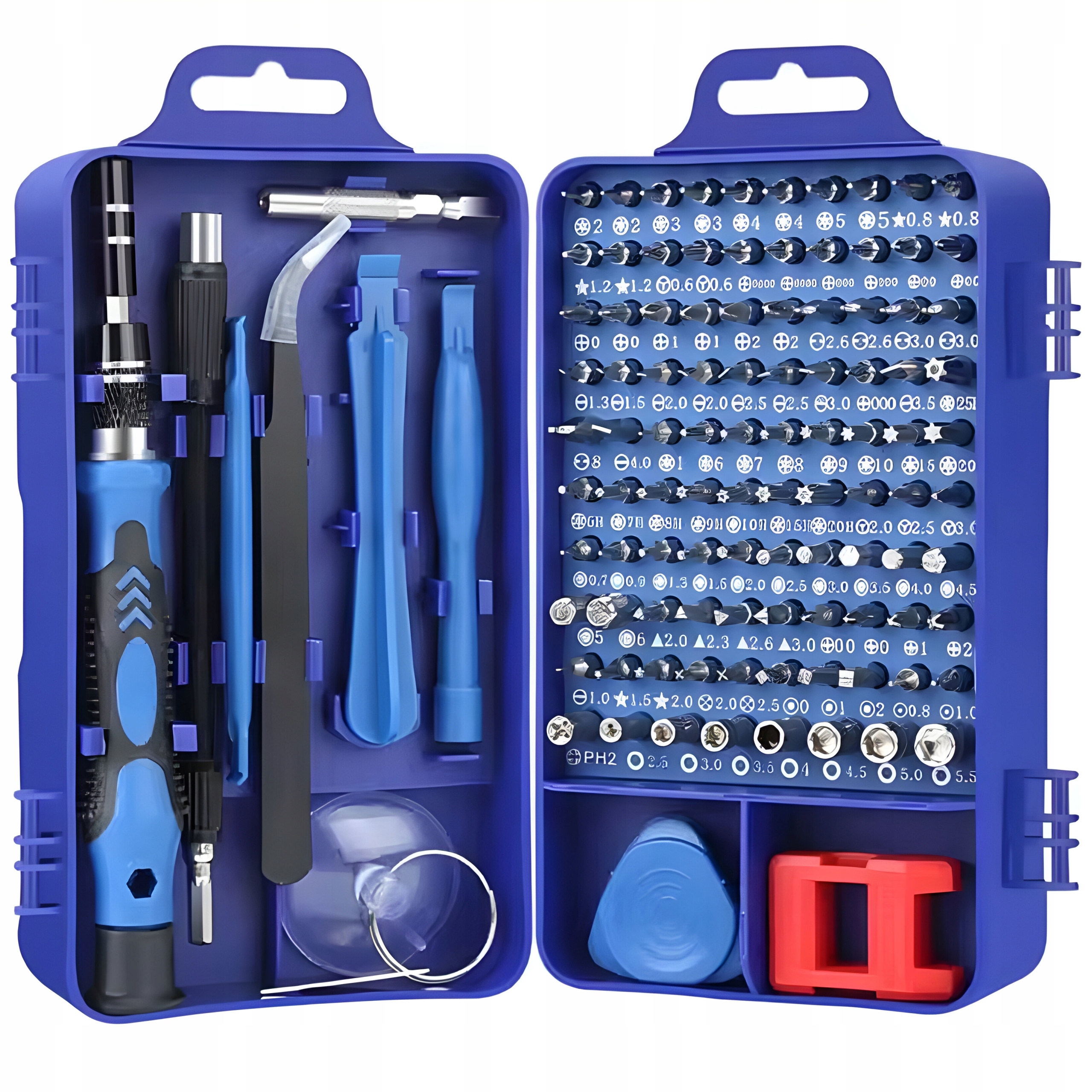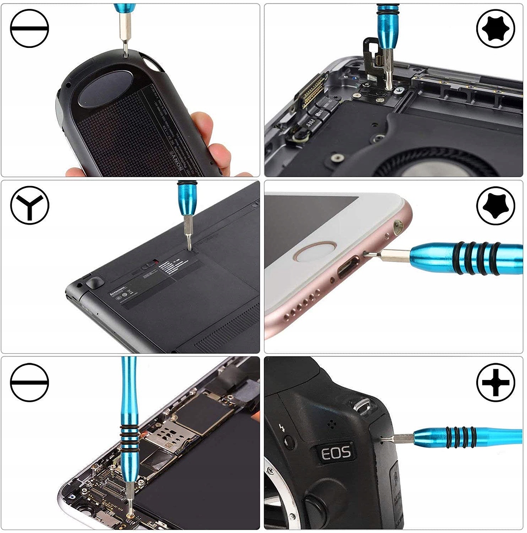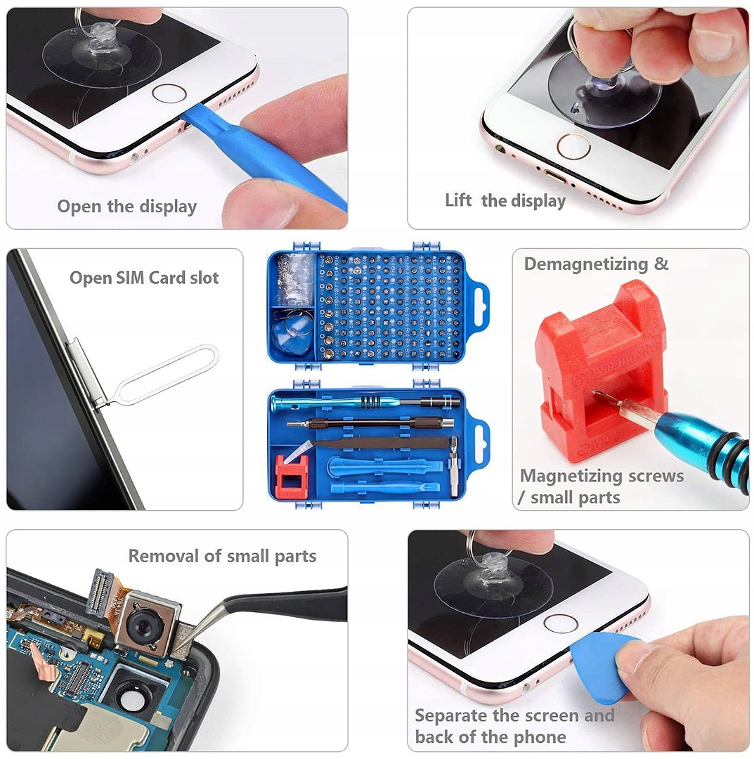 Zestaw 115 precyzyjnych narzędzi, bitów i otwieraków z lekkim aluminiowym uchwytem przeznaczony do precyzyjnych napraw serwisowych telefonów i smartfonów w tym produktów marki Apple oraz wszelkiej elektroniki konsumenckiej.