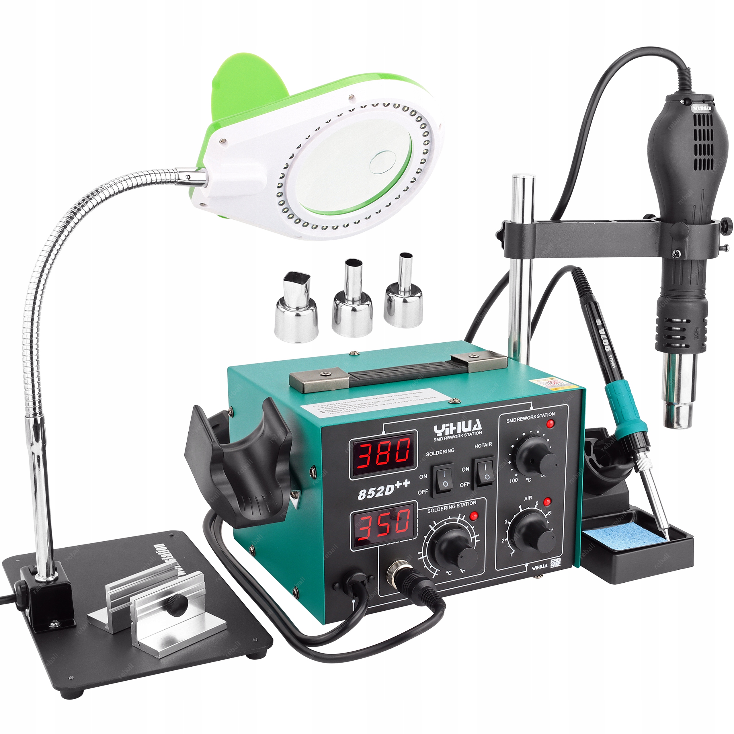 W zestawie lampa LED z lupą I uchwytem PCB oraz extra uchwyt hotair.