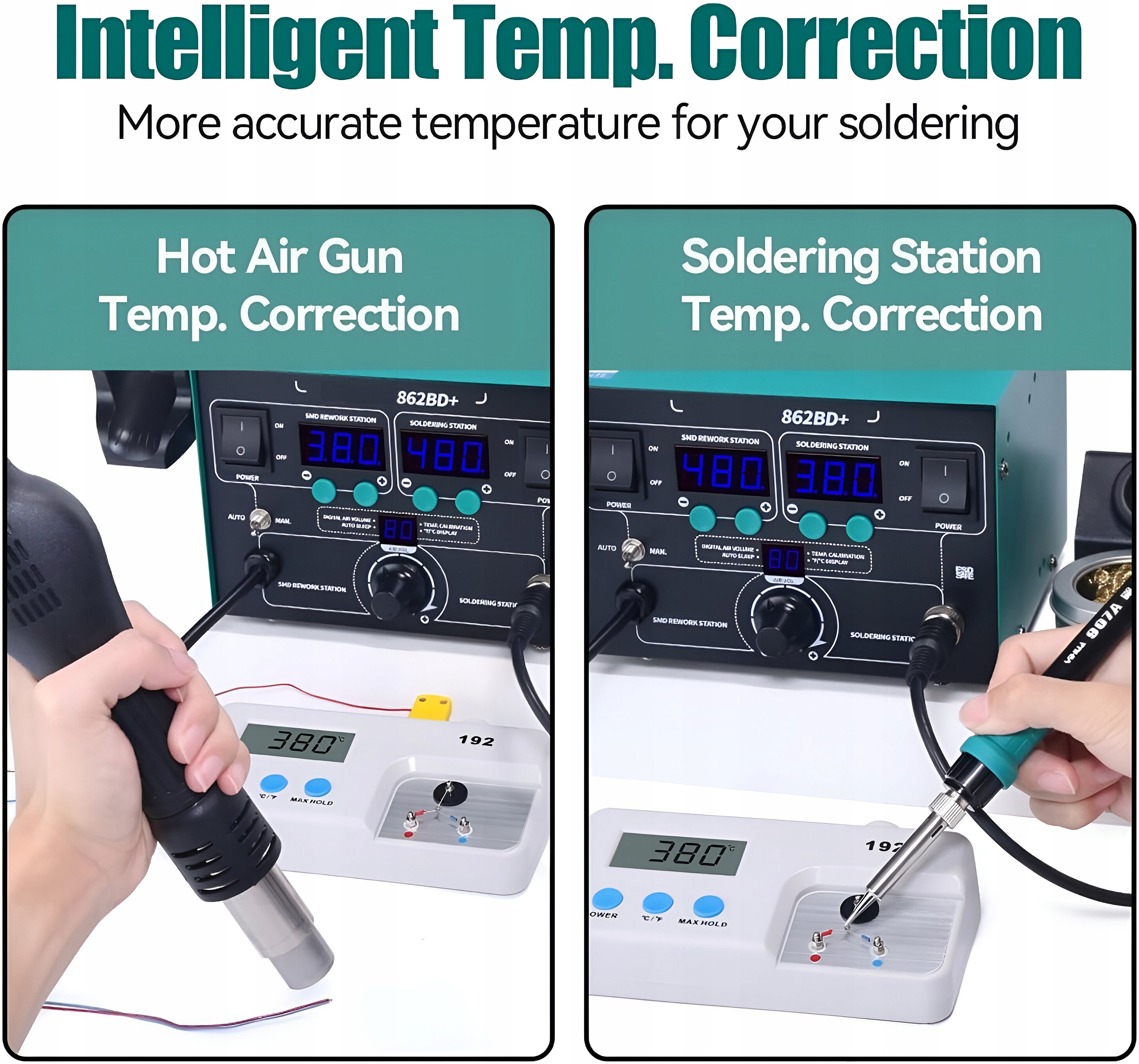 ✅ Wykorzystując technologię hotair, stacja lutownicza Yihua 862BD+ zapewnia precyzyjne i bezpieczne lutowanie za pomocą gorącego powietrza (dokładność ± 1°C) co idealne sprawdza się przy pracy z elementami SMD. Urządzenie osiąga wysokie temperatury w krótkim czasie, a regulacja temperatury od 100 do 480°C pozwala na pełne dostosowanie stacji do każdego projektu.