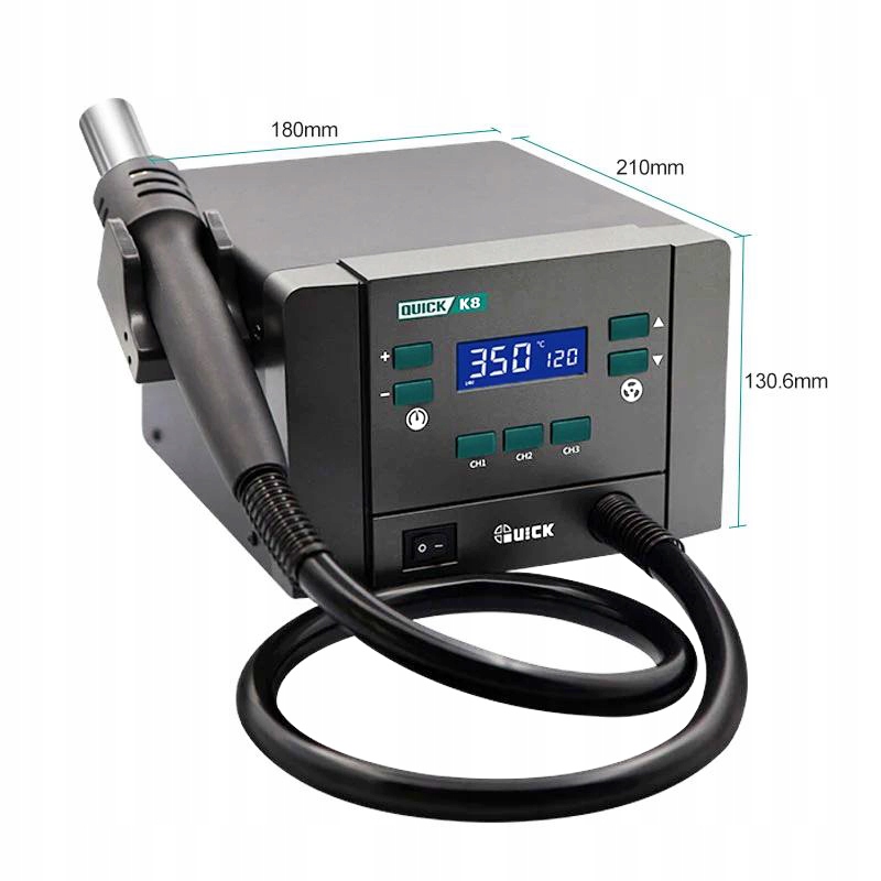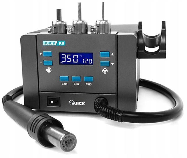 Quick K8 ESD to profesjonalna stacja lutownicza HOTAIR z nadmuchem gorącego powietrza o mocy 1000W i przepływie powietrza 120l/min Jest to następca stacji lutowniczej hotair QUICK 861DW cenionego od wielu lat modelu.