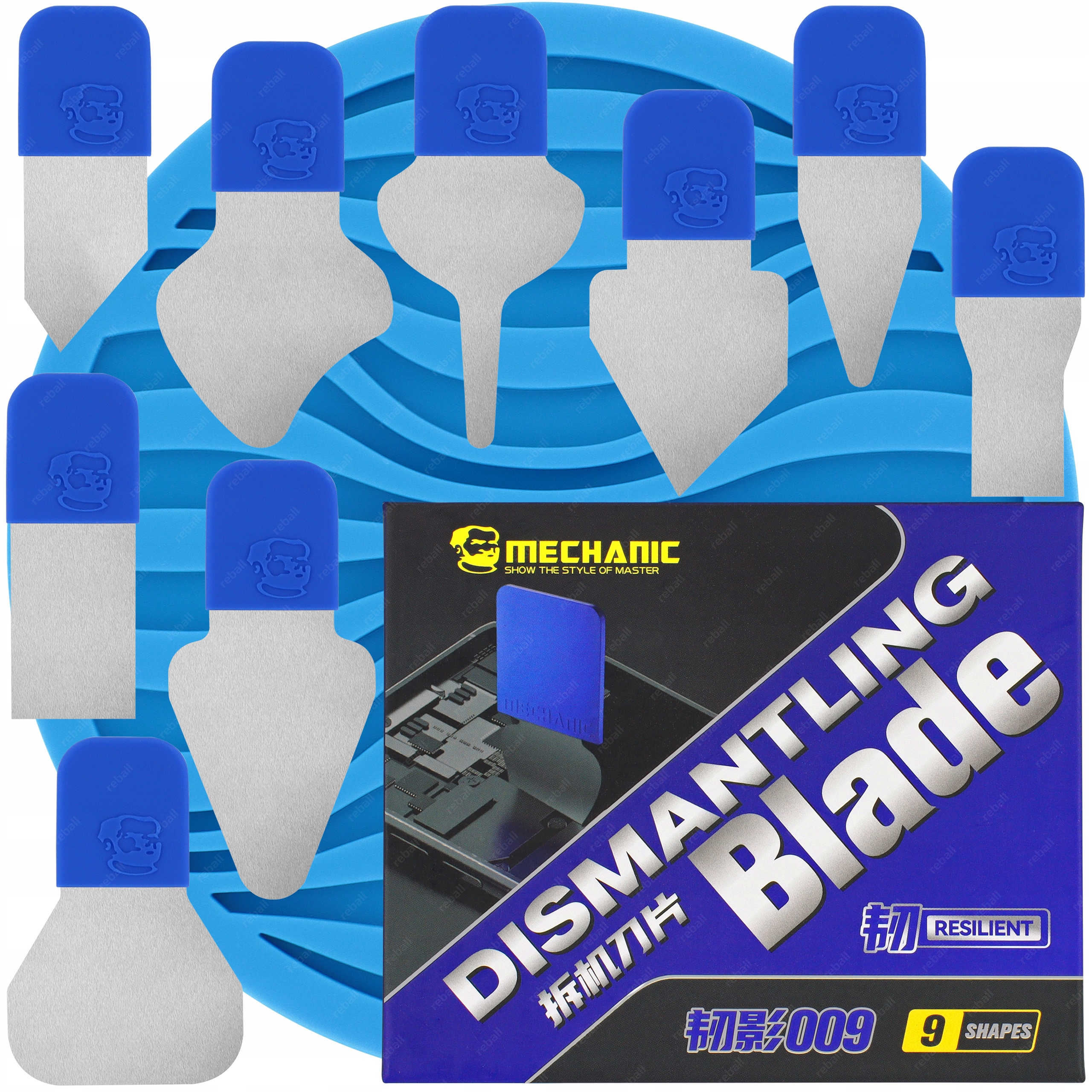 Zestaw 9 uniwersalnych otwieraków MECHANIC 009 o grubości 0,25mm do otwierania wszelkich obudów telefonów, laptopów i innego sprzętu elektronicznego. W czasie separacji dostosowują swój kształt do powierzchni i narożników przez co minimalizują możliwość ich uszkodzenia.