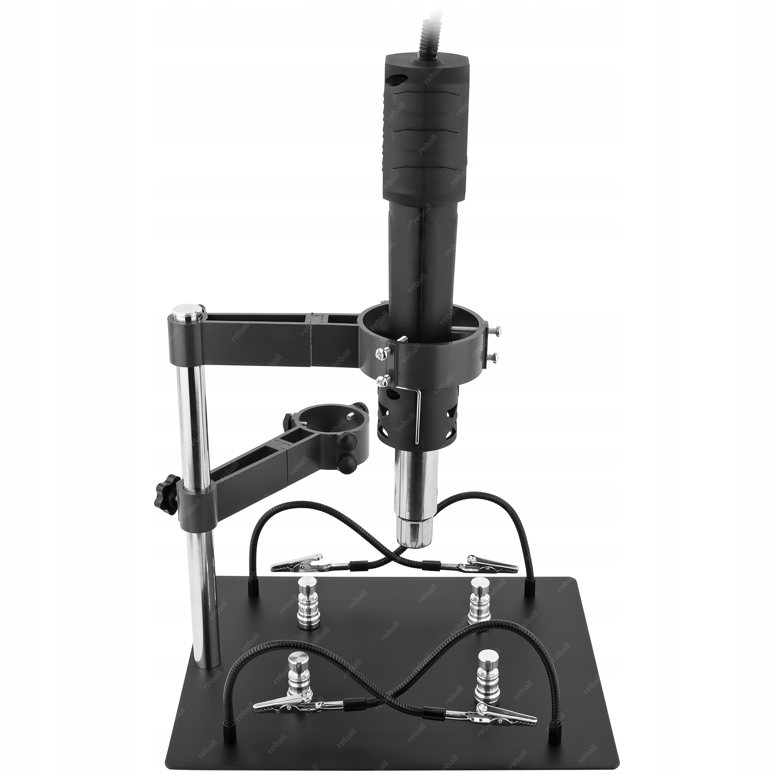 Dzięki regulowanym ramionom oraz dwóm rozmiarom uchwytów, pasuje do większości popularnych kolb hot air, ułatwiając organizację stanowiska pracy.