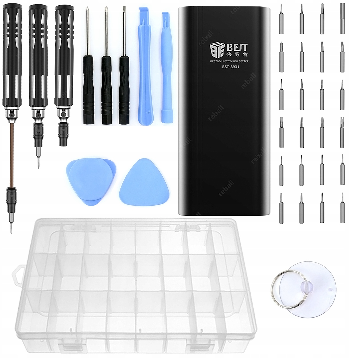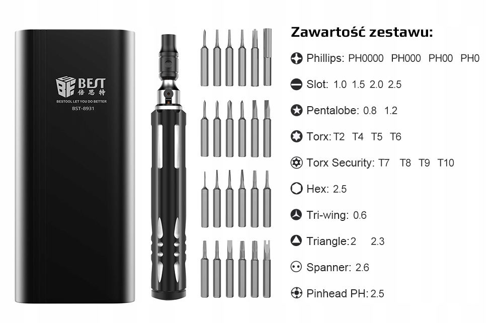 BEST BST-8931 to zestaw 24 magnetycznie mocowanych bitów z aluminiowym uchwytem przeznaczony do precyzyjnych napraw serwisowych telefonów i smartfonów w tym produktów Samsung, Huawei, Xiaomi, Oppo oraz Apple tj iPhone, MacBook Air i Pro.